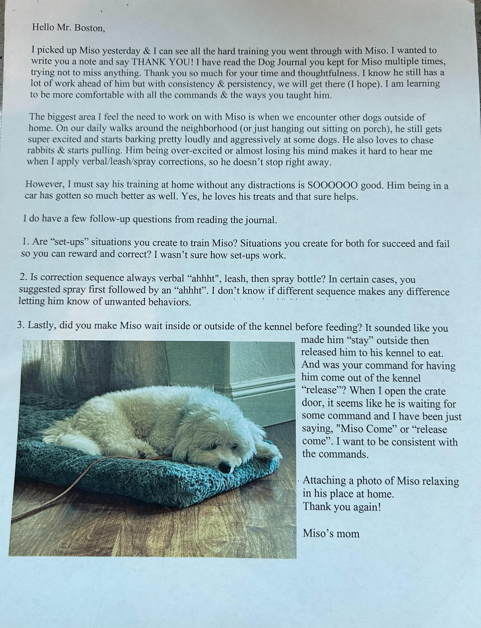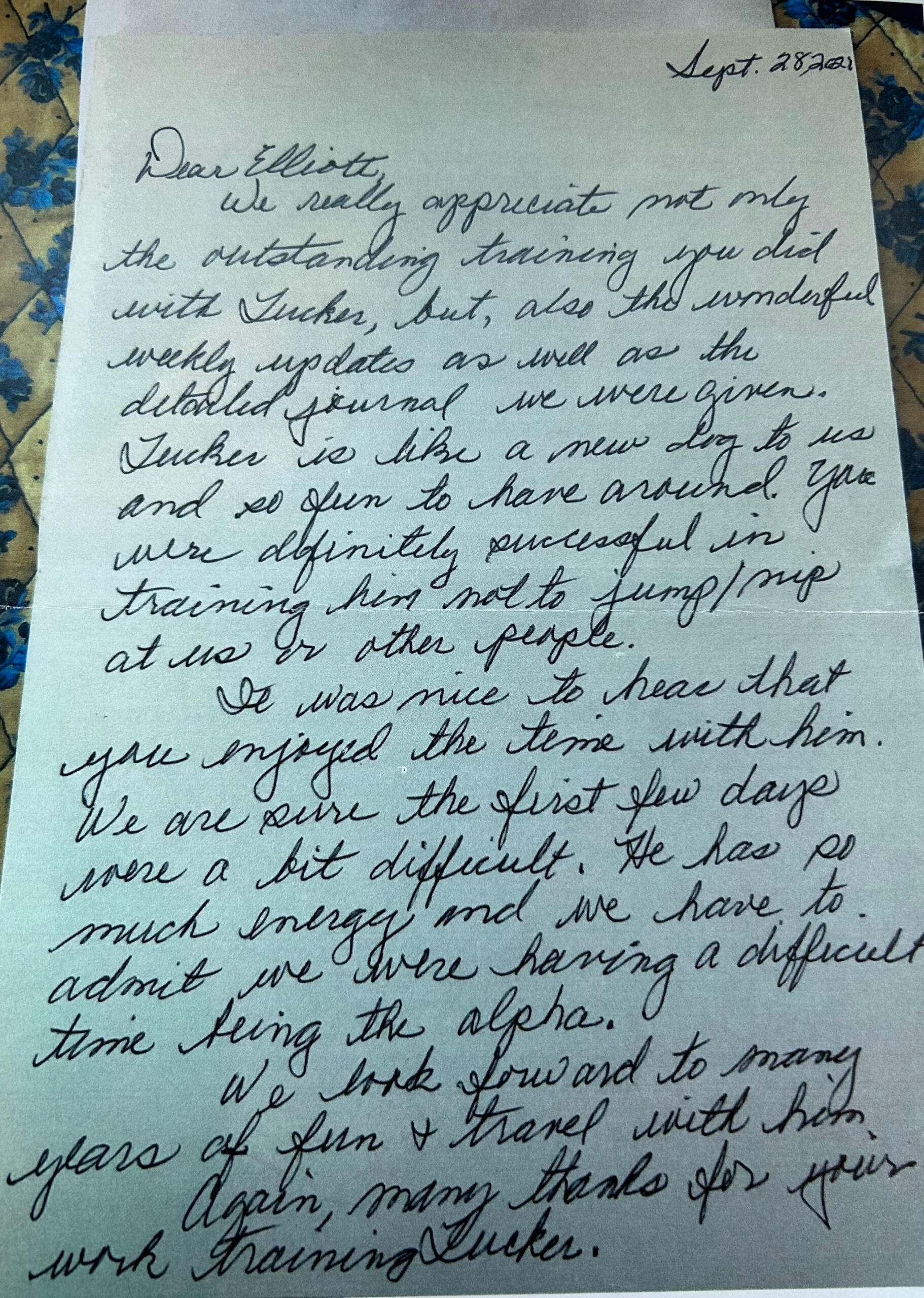 "A very competent, patient, communicative & transparent trainer. Had my animal for 30+ days & he came back all-knowing. He is still a puppy. But one who knows his 'place', will auto-sit, walk with me, not pull me. Will sit, stay, come & release all on command. I could not have asked for a better experience, as I was able to get updates & train alongside of them both. Kudos to Alfa Dog for a job well done."